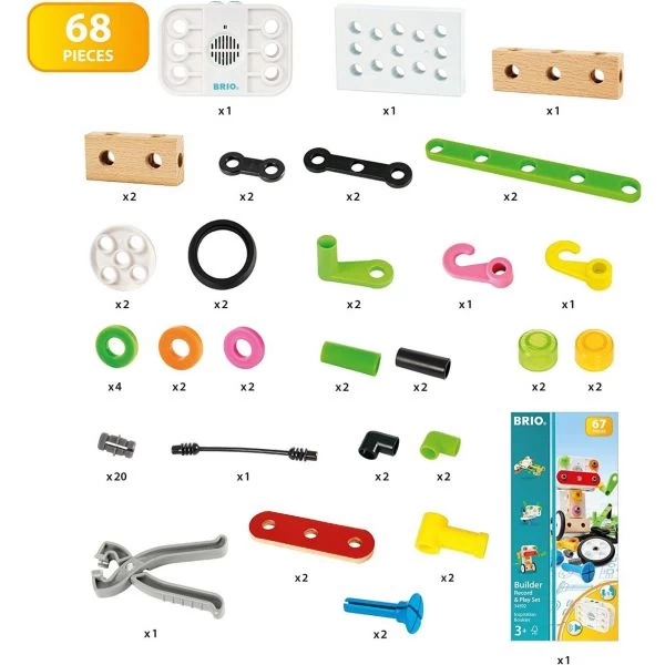 Mit dem Record & Play Set kannst du deine BRIO Builder Kreationen zum Leben erwecken. Das 67-teilige Set beinhaltet einfach zu verwendende Werkzeuge und eine Anleitung mit Bauvorschlägen. Konstruiere tolle neue Spielzeuge, zeichne deine eigenen Sounds auf und hör sie die beim Spielen an. Bei der Suche nach Konstruktionslösungen für ihre Bauvorhaben entwickeln Kinder Problemlösungsstrategien, schulen ihre Vorstellungskraft und lernen auf spielerische Weise. Alle Komponenten sind mit dem BRIO Builder System kompatibel und erweitern die Baumöglichkeiten.