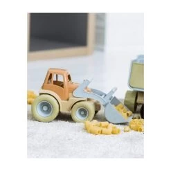 Robuster, unverwüstlicher Traktor in gedeckten, natürlichen Farbtönen mit Frontlader/Schaufel, perfekt für den Sandkasten