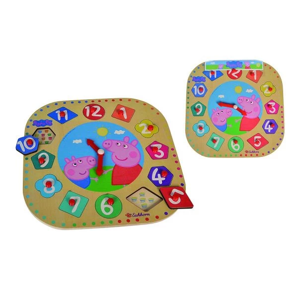 Mit der Peppa Pig Lernuhr lernen die Kleinen spielerisch die Uhr kennen. Die einzelnen Ziffern sind Puzzlestücke mit jeweils unterschiedlichen Formen und Farben, so dass die Uhr kinderleicht erlernt wird. Die Lernuhr von Eichhorn hat einen Durchmesser von 25cm, beinhaltet 12 Steckteile und verstellbare Zeiger. Unter den jeweiligen Zahlen versteckt sich die passende Anzahl von Gegenstände aus Peppa Pigs Welt. Für Kinder ab 2 Jahren geeignet.