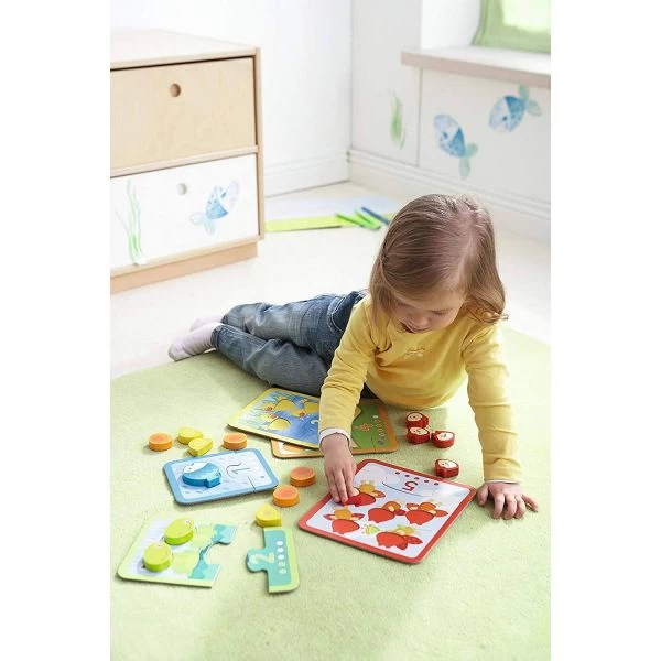 die Holzplättchen zu und lernen so die Mengen bis 5 kennen und