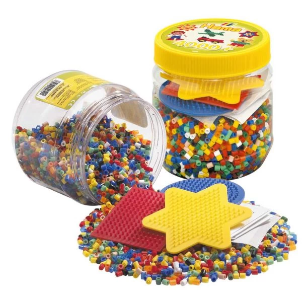 Dose mit ca. 4.000 bunten Bügelperlen in verschiedenen Grundfarben und drei Steckplatten Quadrat, Kreis und Stern