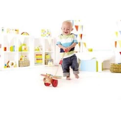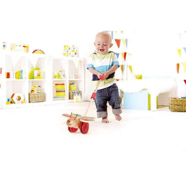 Der Schmetterling flattert eindrucksvoll mit den Flügeln, wenn er geschoben oder gezogen wird. Dieses Spielzeug ist aus hochwertigem Holz hergestellt und eignet sich für Kinder ab 12 Monate.