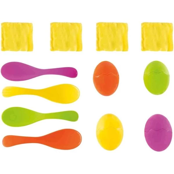 - Eierlaufspiel mit 4 Löffeln, 4 Eiern und 4 gelben Sandsäckchen, die das Eigelb symbolisieren
