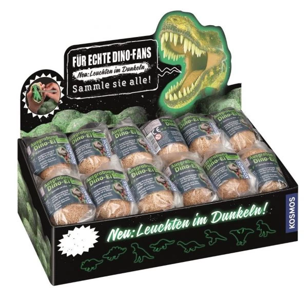 Grabe eine nachtleuchtende Dino-Kunststoffigur aus dem Dino-Ei aus! Mit dem Meißel-Werkzeug geht das in dem besonderen, weichen Gipsmaterial ganz ein-fach, insbesondere dann, wenn man Wasser mit hinzunimmt. So haben schon 5-Jährige Spaß beim selbst Ausgraben. Acht verschiedene Dinos können gesammelt werden