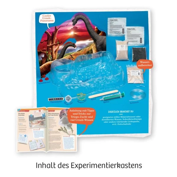 Gigantisch: Diese Triops-Art kann doppelt so groß werden, wie andere Triopse! Das große transparente Becken in diesem KOSMOS Experimentierkasten bietet neben einer Baby-Aufzuchtstation viel Platz zum Schwimmen für die großen Urzeitkrebse. So können Kinder optimal beobachten, wie die Krebse durchs Wasser flitzen, nach Futter suchen oder ihren Panzer wechseln. Im reich bebilderten Anleitungsheft wird nicht nur Schritt für Schritt erklärt, wie die Triopse gezüchtet und gepflegt werden, es warten auch spannende Hintergrundinfos und Versuche, mit denen Kinder das Verhalten der Tiere Tag für Tag erforschen können. Und da Triopse bereits zu Zeiten der Dinosaurier auf unserer Erde lebten, sorgt eine coole Urzeit-Kulisse für die richtige Inszenierung im Kinderzimmer.