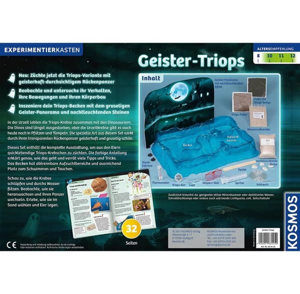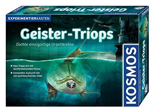 Jetzt können ganz besondere Triopse gezüchtet werden: Geister-Triopse – eine Art, die einen fast durchsichtigen Panzer besitzt und dadurch geisterhaft wirkt. Das Set beinhaltet alles, was zur erfolgreichen Zucht benötigt wird. Damit sich die kleinen Krebschen wohlfühlen, bietet das Becken neben einer Aufzuchtstation viel Platz zum Schwimmen. So können die Urzeitkrebse optimal beim Wachsen, bei der Futtersuche und beim Umherflitzen beobachtet werden. Und damit die richtige Stimmung aufkommt, wird das Becken mit einer coolen Geisterkulisse und nachtleuchtenden Steinen inszeniert. Ein echtes Highlight für jedes Kinderzimmer.