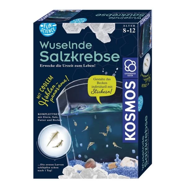 Los geht´s! Becken, Sand, Salz und Eier – alles steht bereit. Anschaulich und gut illustriert erklärt die Anleitung, wie eine artgerechte Zucht vorbereitet wird und bereits nach einem Tag können die die ersten Tiere schlüpfen. Nun heißt es Lupe schnappen und beobachten! Nach und nach entwickeln sich die Larven zu ausgewachsenen Urzeitkrebschen mit Schwimmbeinen und gut erkennbaren Augen. Schon bald herrscht reges Treiben und eine ganze Familie kleiner Salzkrebse flitzt durchs Becken. In spannenden Info-Texten und pfiffigen Fun-Facts erfahren die Kinder Wissenswertes zum Lebensraum und der Entwicklung der Tiere und wie sie sich richtig um ihre kleinen Haustiere kümmern. Für den extra Spielspaß enthält das das Experimentier-Set einen Höhlenaufsteller und einem Stickerbogen, mit denen das Becken individuell gestaltet werden kann. Von 8 bis 12 Jahren.