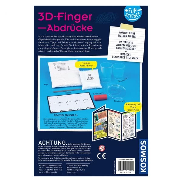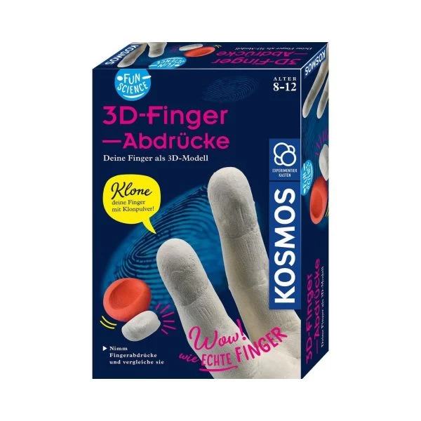 Finger klonen – das geht! In nur wenigen Minuten stellen Kinder von 8 bis 12 Jahren mit dem Abdruck-Set von KOSMOS eine detailreiche Kopie ihrer Finger her. Einfach das Klon-Pulver anrühren, Finger rein, und schon hält es jede Furche fest. Nun wird nur noch Gips in die entstandenen Öffnungen gegossen und nach kurzer Zeit können die eigenen Finger als dreidimensionaler Abdruck perfekt untersucht werden. Ein echter Blickfang auf dem Schreibtisch!