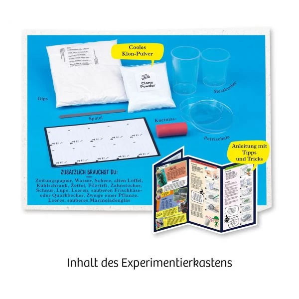 Inhalt: Klon-Abdruckmasse, Knete, Gips, Becher, Messbecher, Spatel, Petrischale, Dokumentationsbogen, Anleitung