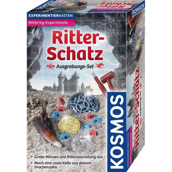 Ein mittelalterlicher Schatz wartet darauf, ausgegraben zu werden! Mit Hammer und Meißel legen kleine Entdecker nach und nach zwei Metall-Münzen, ein Medaillon, verschiedene Spielsteine und einen Drachenzahn aus dem weichen Gips frei. Die farbige Anleitung erklärt die beste Technik beim Ausgraben und verrät spannendes Wissen über Ritter, Drachen und die Arbeit eines Archäologen. Besonders cool: Aus dem freigelegten Zahn und der beiliegenden Schnur entsteht eine tolle Drachenzahn-Kette und beim mittelalterlichen Wurfspiel können die Kids von heute ihre Geschicklichkeit unter Beweis stellen. Ein spannender Ausgrabungs-Spaß von KOSMOS für alle kleinen Ritter- und Mittelalter-Fans ab 7 Jahren.