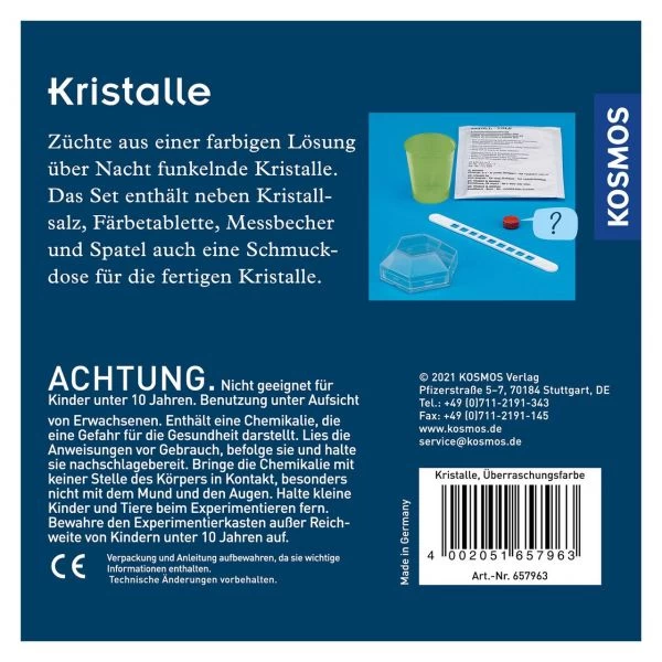 - Spannende Experimente erleben – funkelnde Kristalle in einer Überraschungsfarbe selber züchten. Mit einer der drei Farben: Violett, Türkis oder Orange.