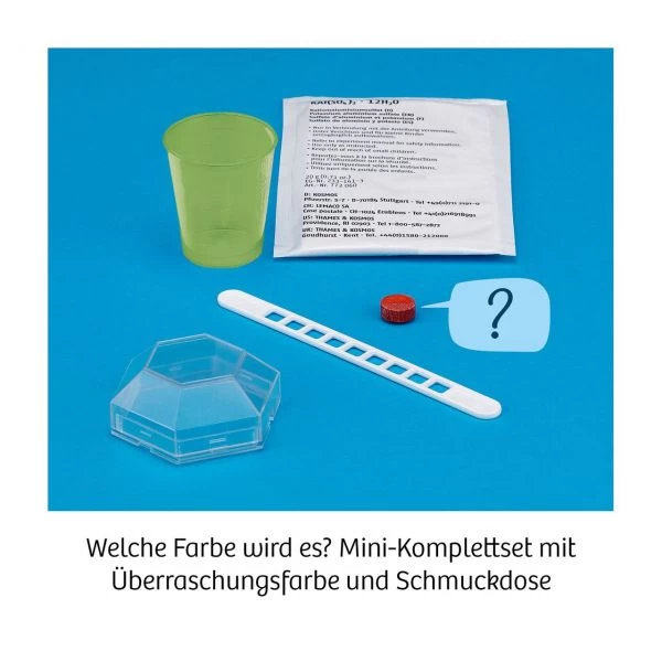 Inhalt: 1 Tütchen Alaun (20g), eine Färbetablette in orange, türkis-grün oder lila, Messbecher, Rührstäbchen, Kristall-Dose, farbig illustrierte Anleitung