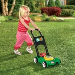 Die bunten, hüpfenden Kugeln simulieren die Aufnahme von gemähtem Gras Motorgeräusche ertönen, sobald man an der Schnur zieht (mechanisch, keine Batterien erforderlich) Klickender Schlüssel und beweglicher Gashahn Enthält einen abnehmbaren Benzinkanister mit Lebhaftes Rollenspiel rund um Haus und Garten