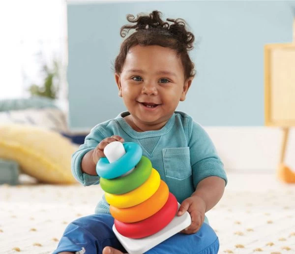 Mit einer Schaukelbasis und 5 bunten Ringen, die kleine Hände gut greifen und stapeln können. Das Aufeinanderstapeln fördert die Augen-Hand-Koordination und bringt dem Baby verschiedene Größen näher, wenn es die kleineren Ringe auf die größeren stapelt!