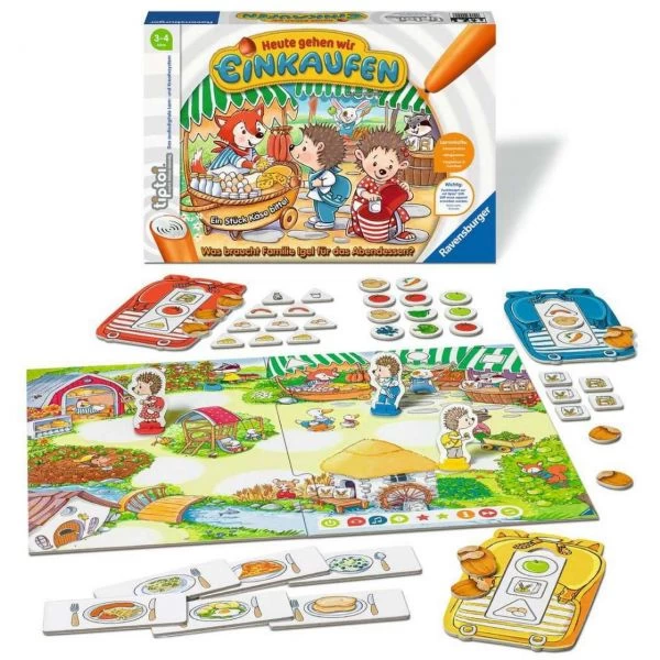Inhalt/Ausstattung: 1 Spielplan, 9 Gerichte-Kärtchen, 27 Zutaten-Plättchen, 10 Nuss-Plättchen, 3 Igelfiguren mit Aufstellfüßen, 3 Rucksack-Kärtchen, 1 Spielanleitung / tiptoi® Stift muss separat erworben werden