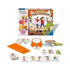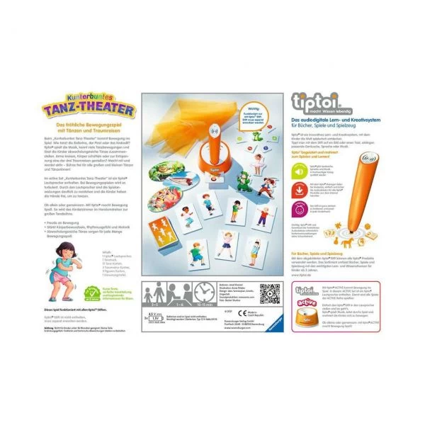 Mit dem ACTIVE Set Kunterbuntes Tanz-Theater kommt Musik ins Spiel. 1 bis 6 Kinder ab 3 Jahren stellen sich ihren eigenen Tanz zusammen. Abbildungen auf Karten und die Erklärung von tiptoi helfen, die Bewegungen mitzumachen. Liebevolle Musikstücke und das Tanztuch motivieren zum Tanzen. Der tiptoi-Stift steht in einem Lautsprecher, damit sind die Texte gut zu verstehen und die Kinder haben die Hände frei, um im Raum zu tanzen.