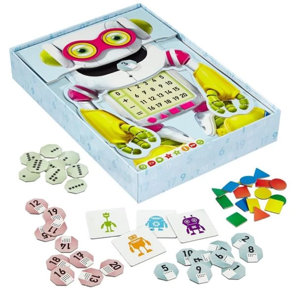 Was ist ein Dreieck? Wie sieht eine 4 aus? Was ist 5 + 2? Robby hat großen Hunger! Wenn die Kinder Robbys Aufgaben richtig lösen, legen sie den Chip in seinen Mund und schwupps ist er auch schon im Bauch des hungrigen Roboters verschwunden. Robby singt und lacht mit den Kindern, hat viele lustige Spiele auf Lager und wird sogar zum Taschenrechner. Inhalt: 3 Stanztafeln Robby mit beweglichem Mund, 50 Zahlen- und Formen-Chips, 4 Spielertafeln