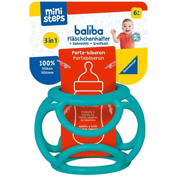 Der baliba Fläschchenhalter ist eine praktische Trinkhilfe, Greifling und Beißring in einem. Dank der Flexibilität des hochwertigen Silikons wird der Halter einfach über ein beliebiges Trinkfläschchen gezogen: So lernen Babys spielerisch, eigenständig zu trinken. Ohne Fläschchen wird der Halter zu einem spannenden biegsamen Greifling, der sich außerdem als Zahnhilfe eignet. Der Fläschchenhalter kann in der Spülmaschine gereinigt werden.