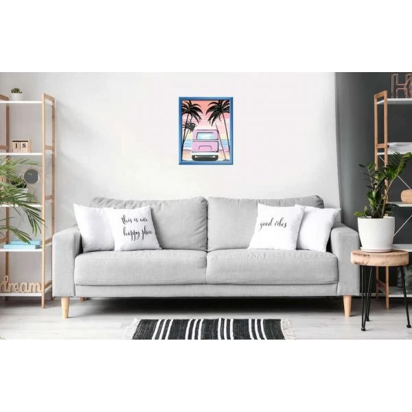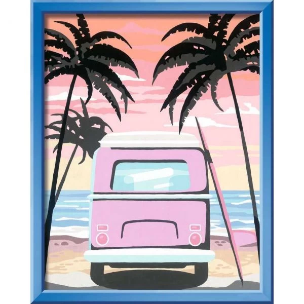 Das coole vintage California Surfing Motiv mit einem rosa Wohnwagen am Strand liegt voll im Trend und sorgt für großartigen Malspaß für Erwachsene ab 12 Jahren