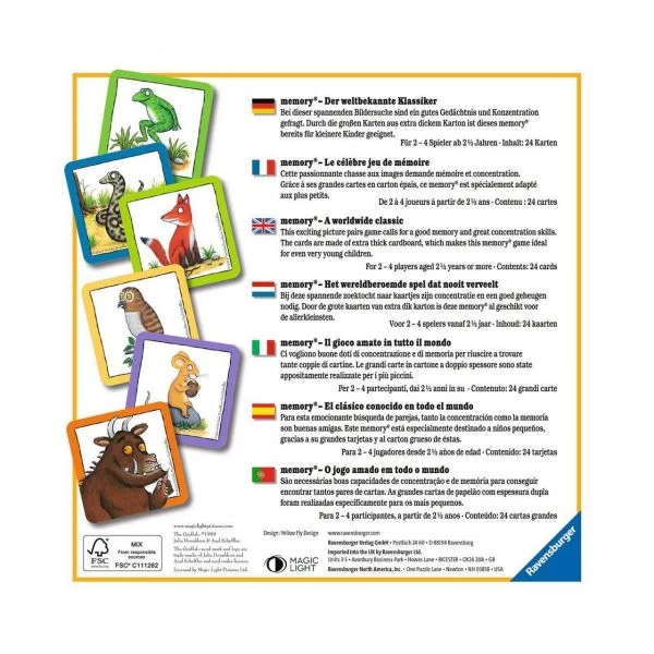 My first memory® wurde speziell für kleine Kinder entwickelt. Die großen, dicken Karten sind für Kinderhände hervorragend geeignet. Mit dem Grüffelo macht die Suche nach den passenden Bildpaaren großen Spaß und spielerisch werden dabei Gedächtnis und Konzentration gefördert! Verschiedene Spielmöglichkeiten sorgen für Abwechslung.