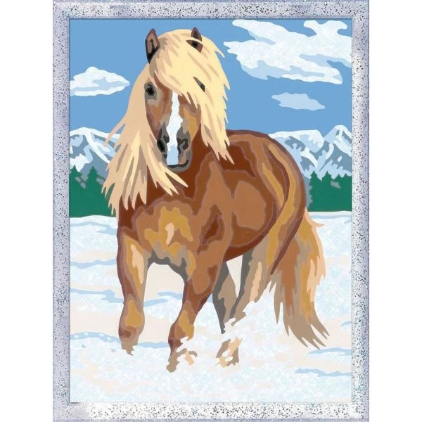 Süße Malvorlage mit einem Pfer im Schnee für Kinder ab 9 Jahren mit farbigen Motivlinien und passendem Rahmen und Glitzereffekt