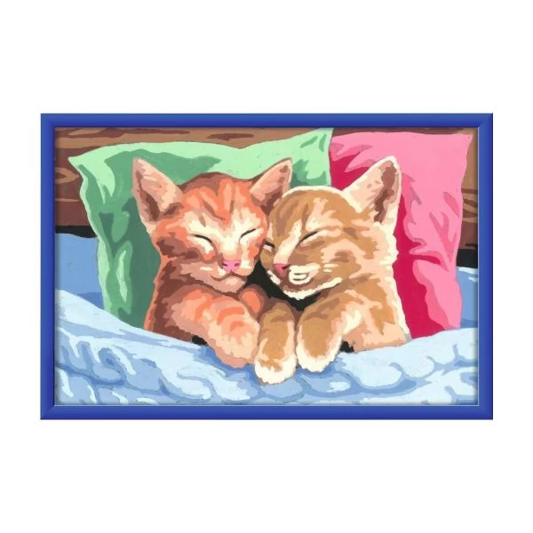 Dank der farbigen Motivlinien, können die Kinder das ganze Motiv Verschmuste Kätzchen und die Farben schneller erkennen. Der Pinsel hat eine gute Führung und so entsteht nach und nach ein perfektes Bild.