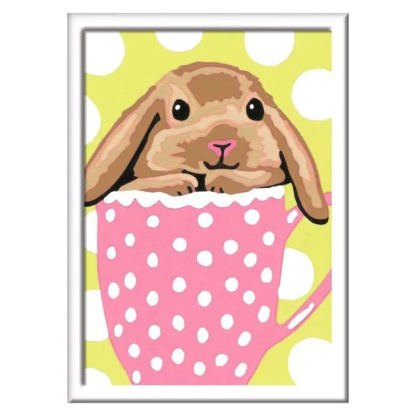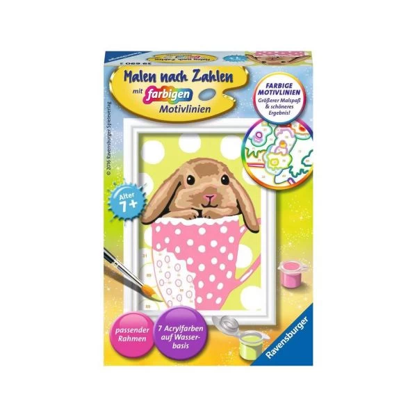 Dank der farbigen Motivlinien, die die Malfelder umranden, können die Kinder das ganze Motiv Häschen in der Tasse und die Farben schneller erkennen