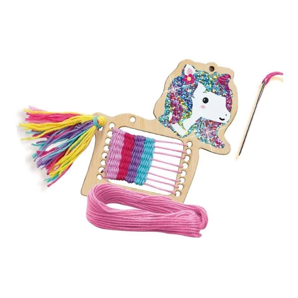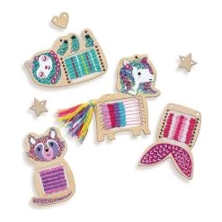 Das Set enthält verschiedene Webrahmen aus Holz, Wolle in den Farben Blau, Rosa, Gelb, Pink, Lila und Weiß, Glitzersticker, Webnadel, 1 Anleitung.