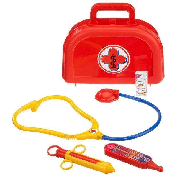 Doktorköfferchen, halbrund, klein. Doktorkoffer mit zahlreichem Zubehör, wie z.B. Stethoskop, Spritze und Thermometer.