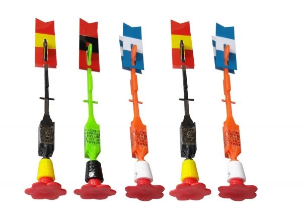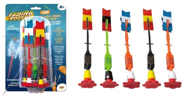 Flying Rocket – leuchtende Pfeile mit großartiger Flugtechnik! Die Flying Rockets fliegen nicht nur in atemberaubende Höhen, sondern leuchten auch noch dabei, sodass bei Tag und Nacht tolle Leuchteffekte in der Luft entstehen. Das Licht lässt sich an den Rockets ein- und ausschalten. Mit den mitgelieferten Schleudern lassen sich die Rockets hoch in die Luft schießen. Sobald sie wieder Richtung Boden fliegen, klappen die Flügel auf, sodass die Rockets sanft nach unten segeln und dabei den Himmel mit tollen Lichteffekten bereichern.